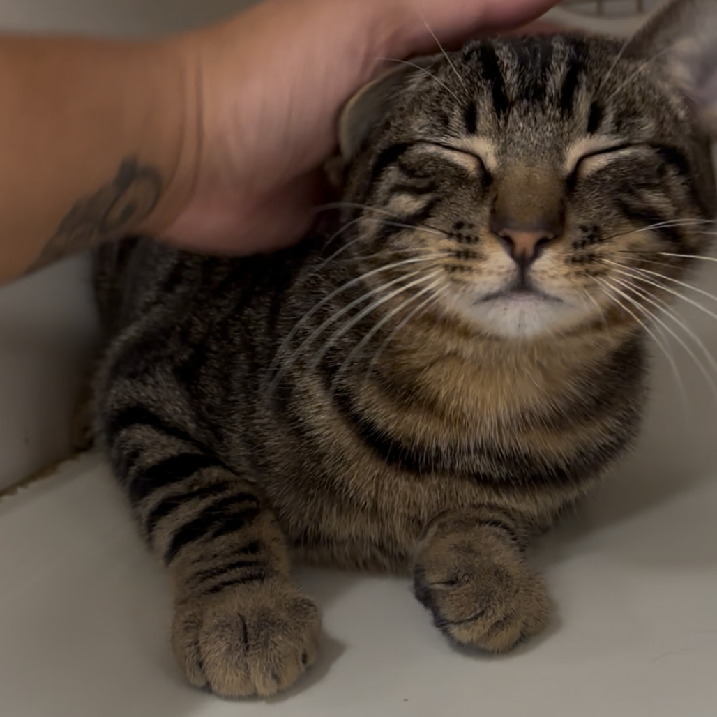 Furret is a brave survivor with a remarkable transformation story. When first rescued, he was found lying motionless under the sun, eyes closed and mouth open, struggling to breathe. With care and time, he recovered physically—but his early days were spent as a wary, feral cat who kept his distance from people.