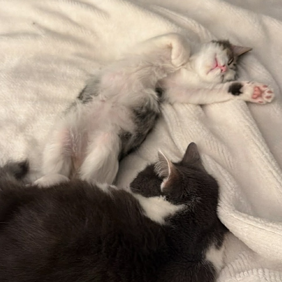 What truly helped Smokey come out of his shell was having another cat around. He loves being near other cats, even though he may hiss at first when meeting them. His foster mom says he copies exactly what her cat does and follows her everywhere. Over time, he bonded so closely with her that he now sleeps in her bed and curls up on her belly every night.